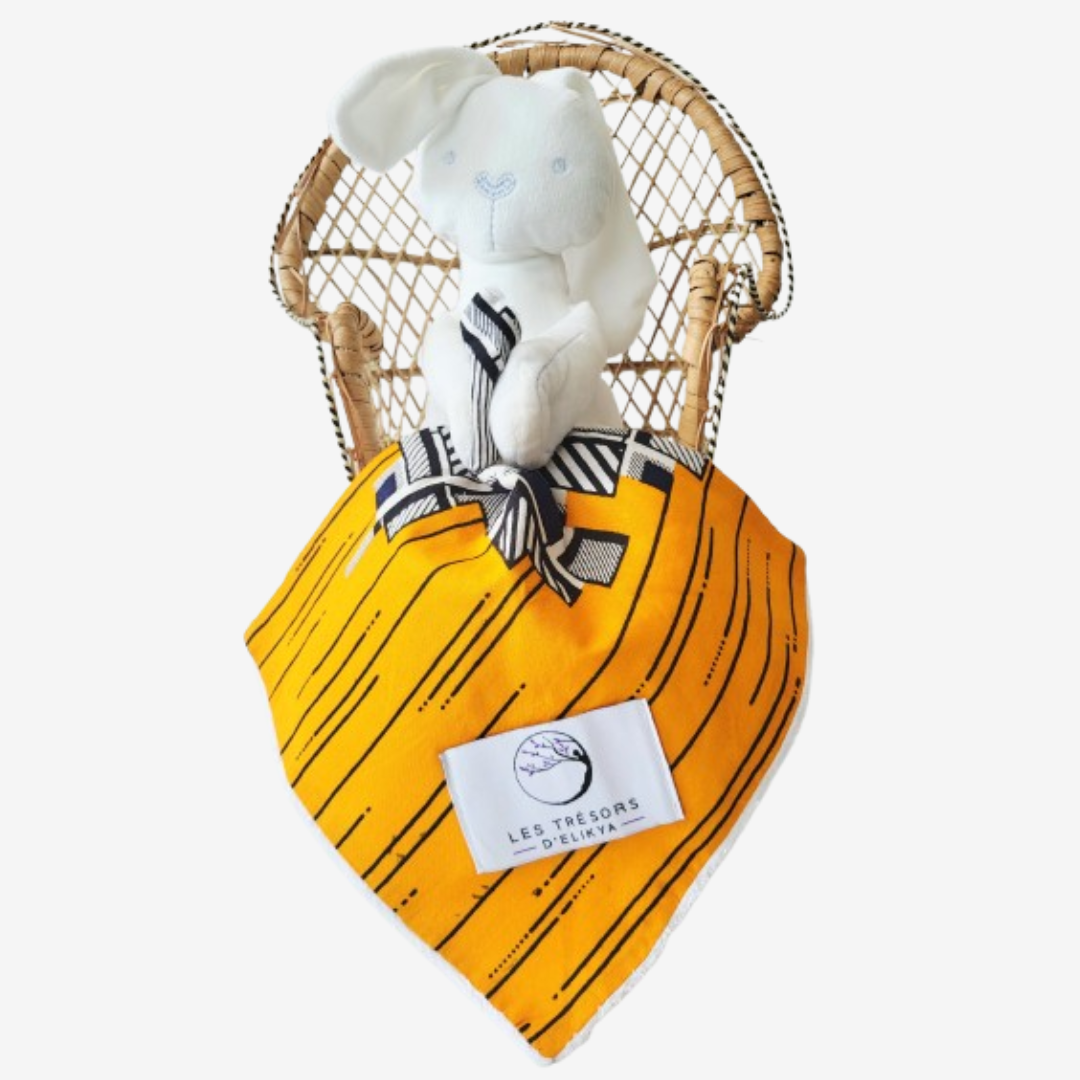 Un lapin douillet accompagné de sa mini-couverture en Wax : " Mini-couverture aux motifs géométriques bleu et blanc sur fond orange brûlé, animée de subtils jeux de relief".