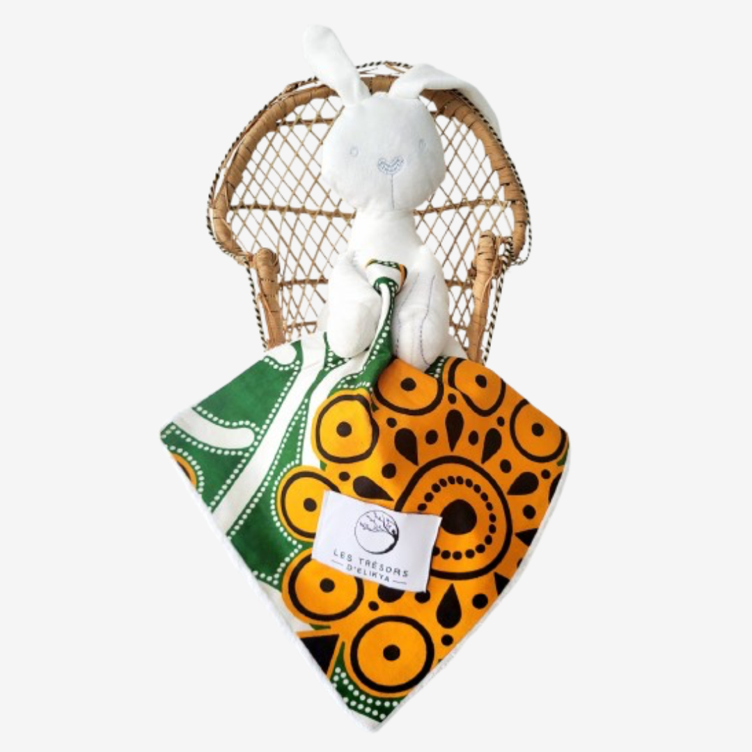Un lapin douillet accompagné de sa mini-couverture en Wax : "Motifs avec des gouttes jaune safran, vert forêt et noir profond".