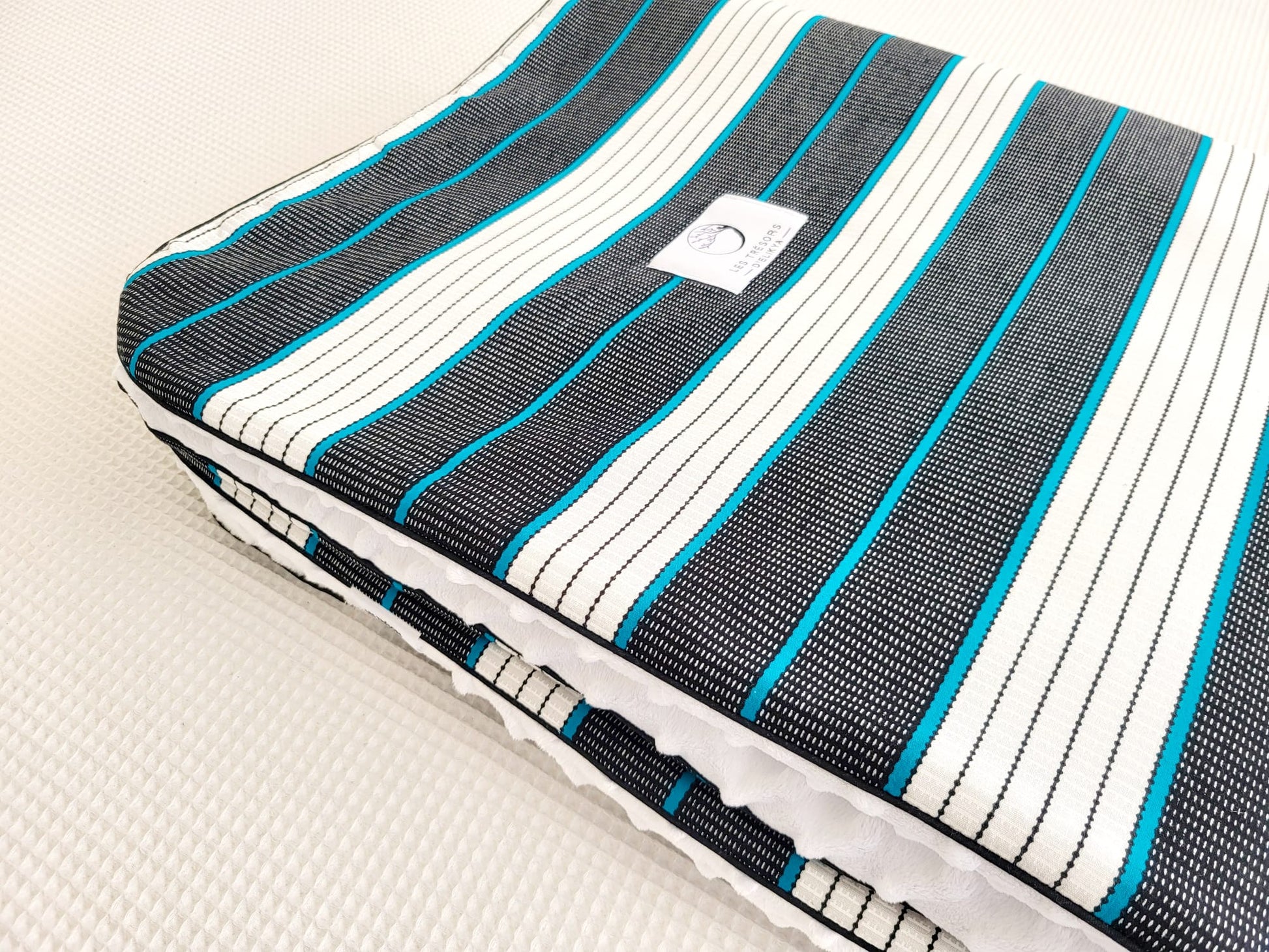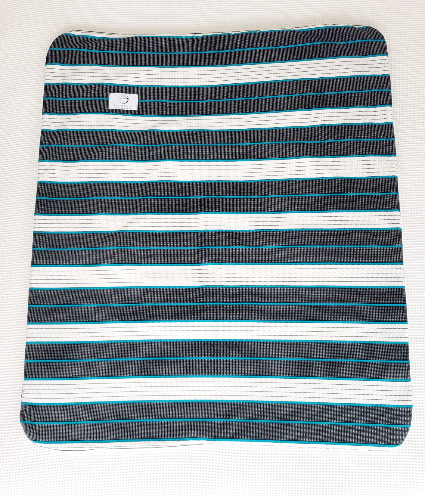Couverture et Doudou Assortis : tissu Wax aux lignes turquoise délicatement tracées, dans une danse équilibrée de noir profond et de blanc éclatant.