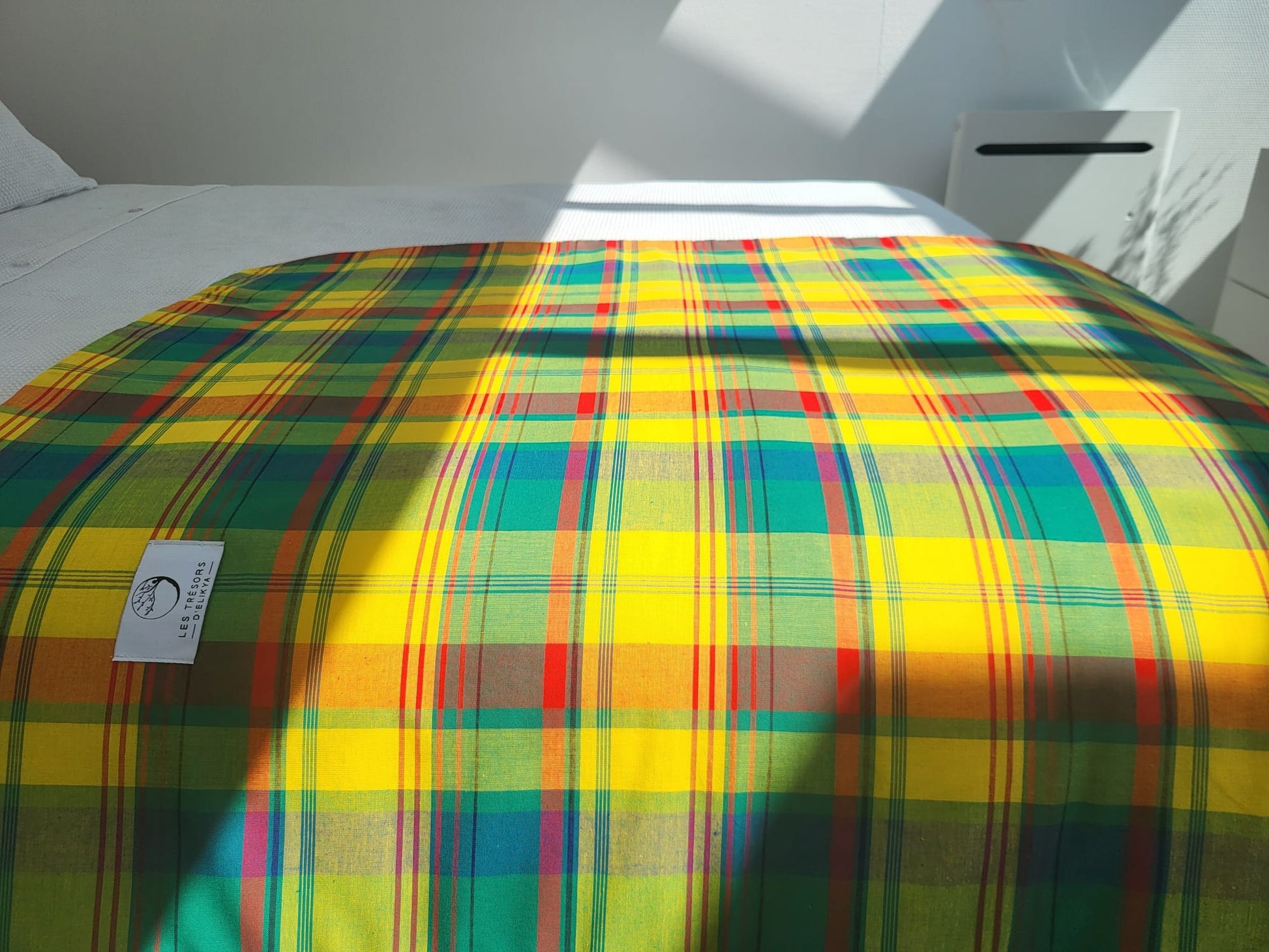 Couverture et Doudou Assortis : Tissu Madras vert, rehaussé de lignes jaunes et rouges.