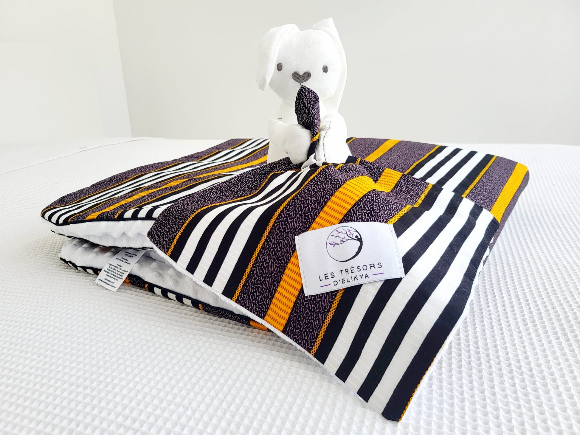 Lapin Bunny Wax avec sa mini-couverture coordonnée, confectionné à la main dans le même tissu que la grande couverture.