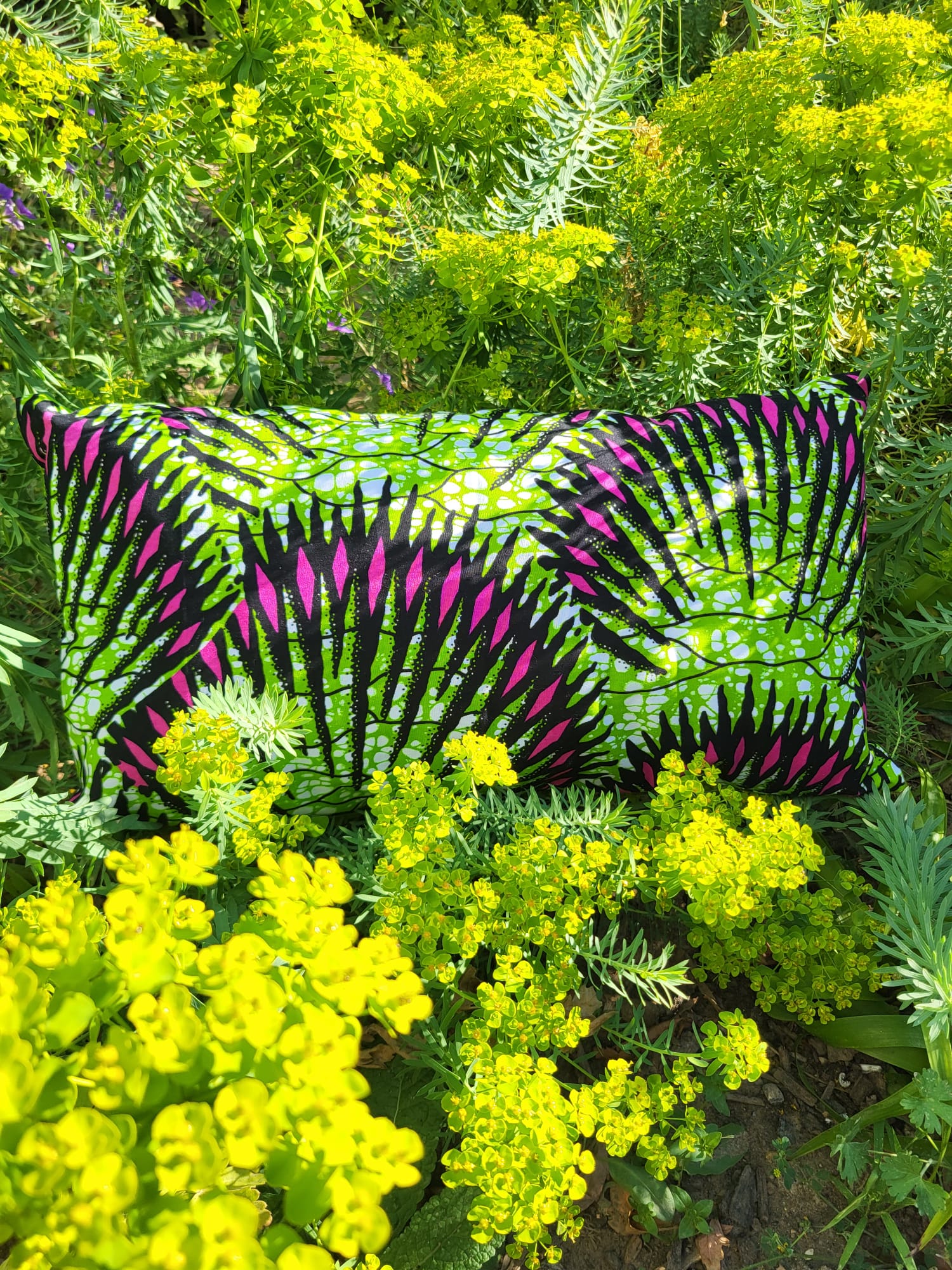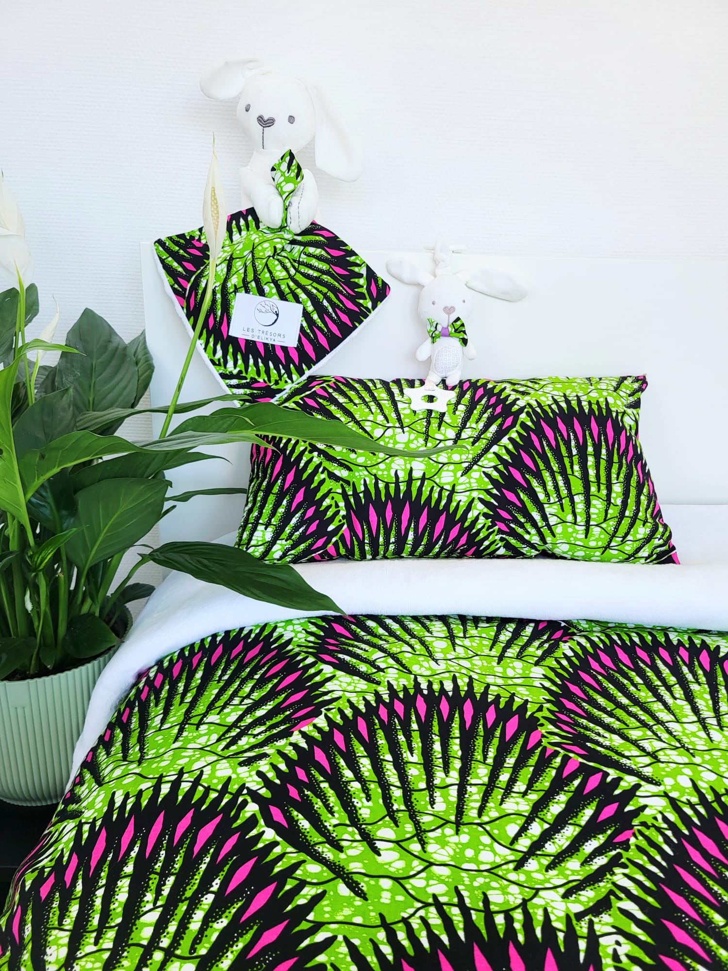 L’Écrin Douceur NÉOLYS marie la douceur du tissu polaire à l’éclat du Wax artisanal, soigneusement sélectionné pour ses motifs feuillagés verts éclatants et ses touches de rose fuchsia. Chaque pièce est confectionnée à la main avec soin, pour offrir un cocon aussi unique que précieux.