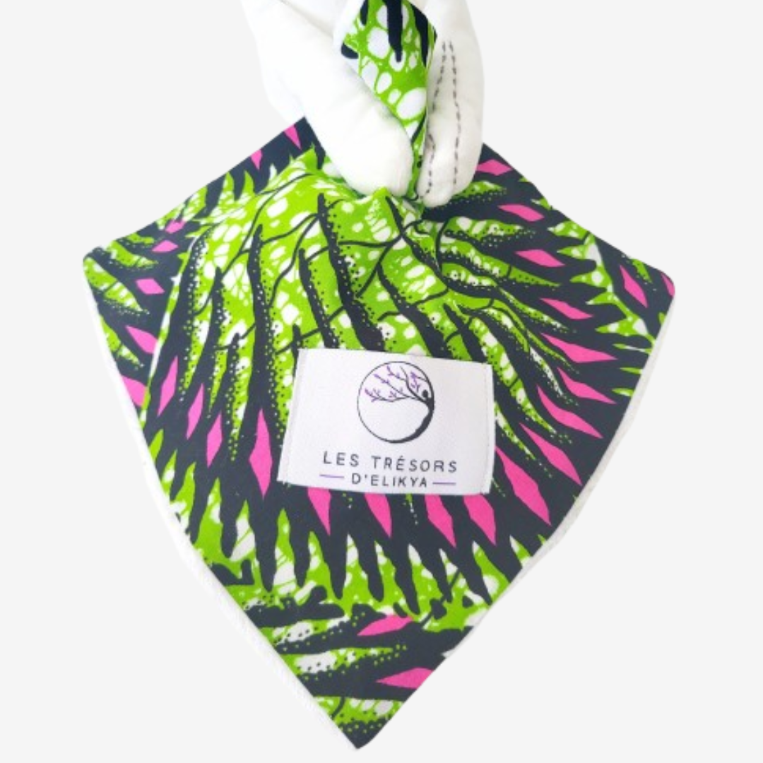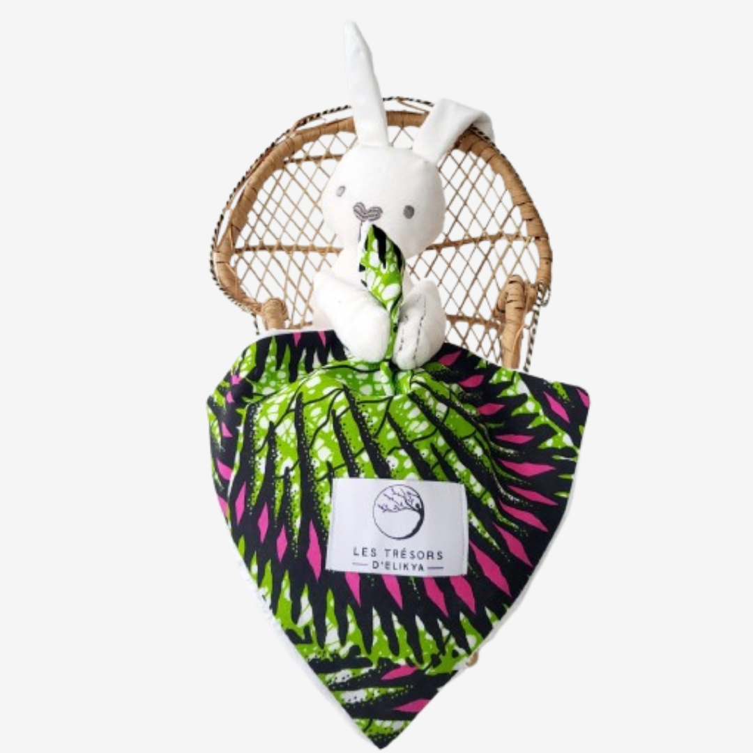 Un lapin douillet accompagné de sa mini-couverture en Wax : "Motifs feuillagés verts éclatants avec des touches de rose fuchsia".