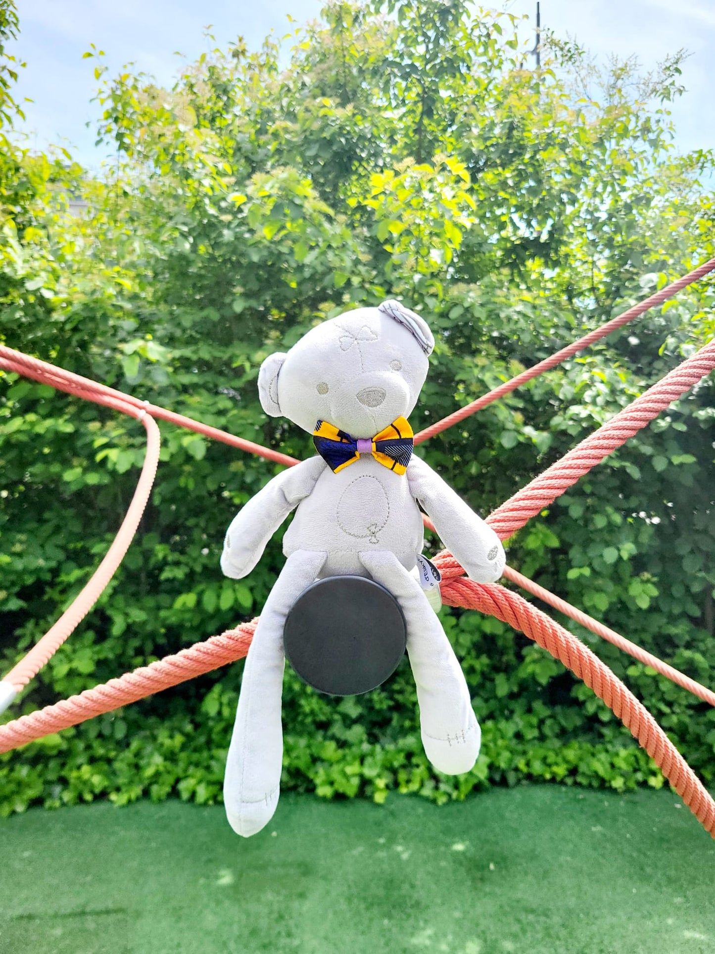 Ourson Gris Élégant avec son Noeud Papillon Wax : "motifs géométriques bleus sur fond orange".